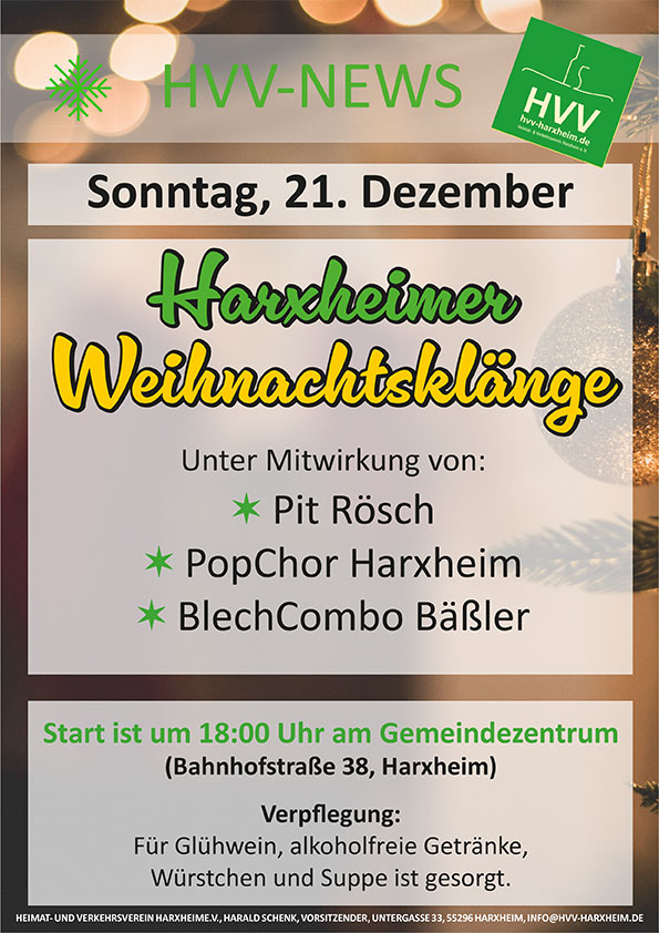 Harxheimer Weihnachtsklänge + Zu Google Kalender hinzufügen + iCal / Outlook exportieren Datum 21. Dez.. 2025 Uhrzeit 18:00 Standort Gemeindezentrum Bahnhofstraße 38, 55296 Harxheim Veranstalter Heimat- und Verkehrsversverein Harxheim e.V. (HVV) E-Mail info@hvv-harxheim.de Webseite https://hvv-harxheim.de/